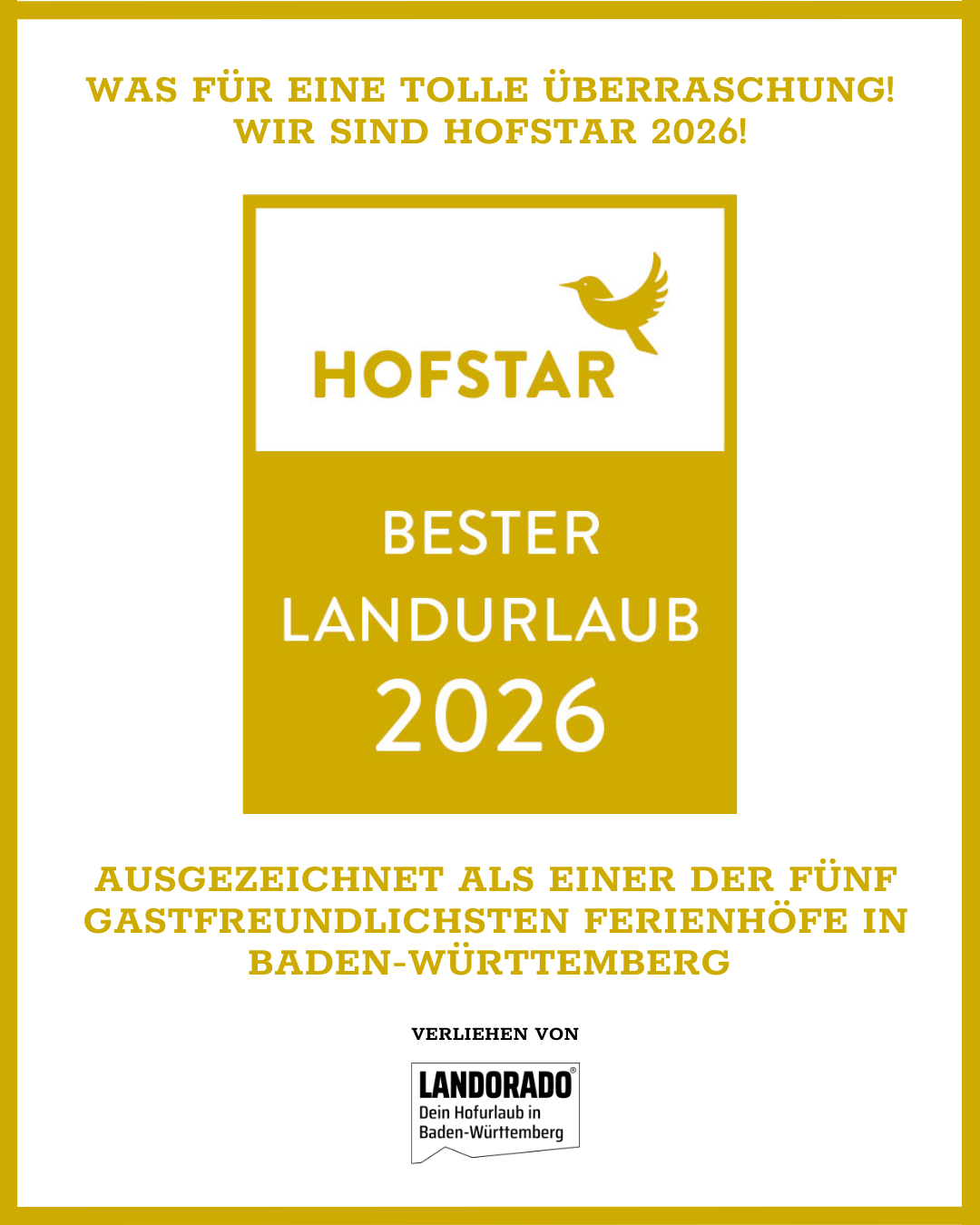 Der Kernenhof ist aktueller Preisträger im Landeswettbewerb „Familien-Ferien“. Wir sind vertreten bei Holliday-Check und im Gastfreund-Reiseführer. Unsere Landwirtschaft und unsere Ferienwohnungen sind außerdem mit zahlreichen Qualitätssiegeln ausgezeichnet.