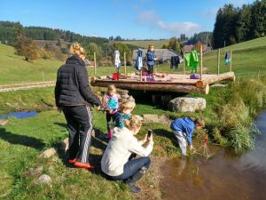 die Herbstsonne an unserem Weiher genießen, die Kinder lassen ihre selbst gebastelten Boot schwimmen und sind voller Freude